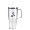 The Bullet Red Lucien Recycled Acrylic Travel Mug 40oz has a large capacity for fewer refills and features a slim base that fits most cup holders. The carry handle allows for a comfortable grip. The splash-proof press-on lid with a silicone gasket secures the straw in place. The translucent, color-matching straw and lid are sure to turn heads with bright corporate artwork.