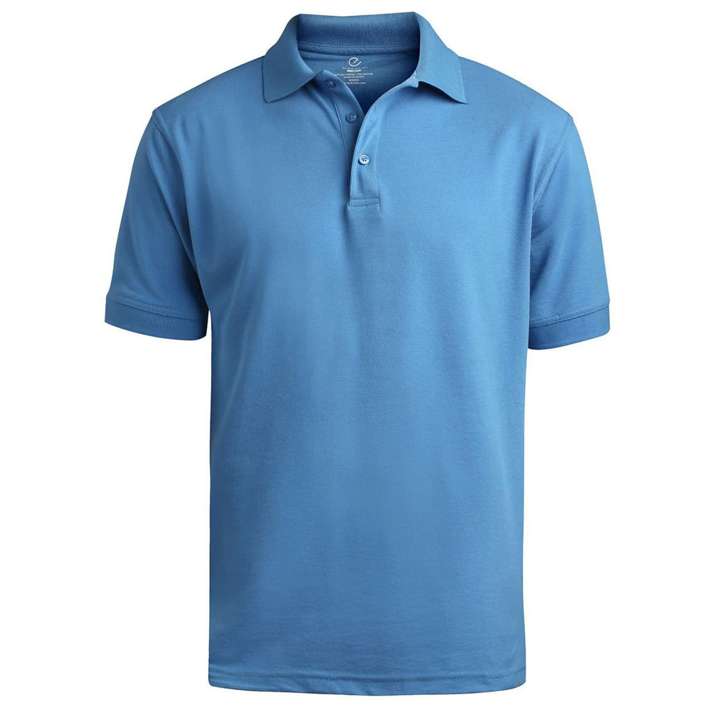 Edwards Men's Marina Blue Soft Touch Pique Polo with embroidery is the ideal option as employee apparel for many industries. The short sleeve polyester cotton blend is made to be worn daily and cleaned by industrial laundry or an at home machine. Add a company logo to show affiliation on the shrink resistant fabric that is also fade and wrinkle resistant. An extended tail offers extra coverage so bending and stretching during work hours is not a concern. Try a custom logo to create a polo that can work as team gear, show team support, or just build your own customized wardrobe.Highlights