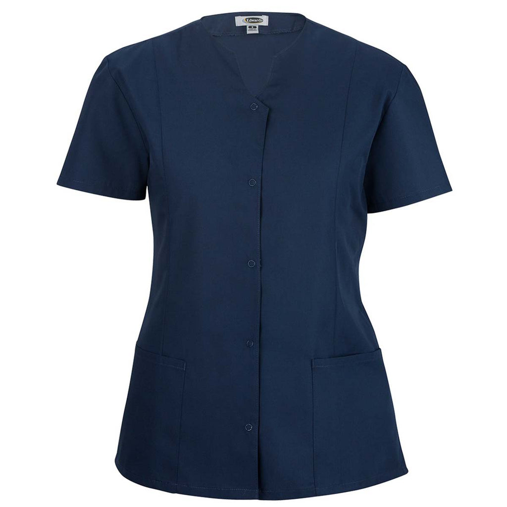 Be at the forefront of employee apparel with the Edwards Women's Vintage Navy Snap-Front Smock Shirt in vintage navy or black. Add a custom embroidery to the polyester cotton blend smock for your employees. Perfect for housekeepers, medical environments, and even spas, these short sleeve smocks offer two large patch pockets, princess seams with notch v-neckline for added appeal. Side vents at the hem mean movement is not hindered and the easily laundered smock can stand the test of time. Order several to use for hospitality apparel or general employee wear.Highlights