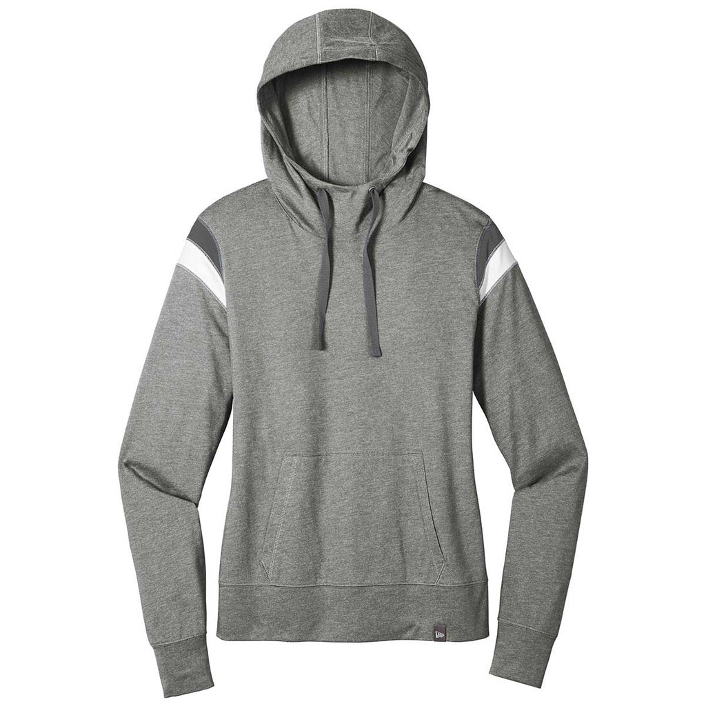 Enjoy a custom screen print look with the New Era Women's Shadow Grey Heather/Graphite/White Heritage Blend Varsity Hoodie. Made of a cotton rich and poly blend, this cropped fit hoodie is a must have for team events or as an employee gift that can be worn while enjoying a day off. The extra soft hoodie is great for game days with sport-inspired stripes on the shoulder area that make this hoodie unique. The three-panel hood will protect you from the elements with tonal twill drawcords and metal eyelets. Sitting at the hip, this is both a fun and functional piece. Add a custom logo to support a specific team or a corporate design as needed. A front pouch pocket keeps all your gear close at hand as you head to the gym or hang out with friends.