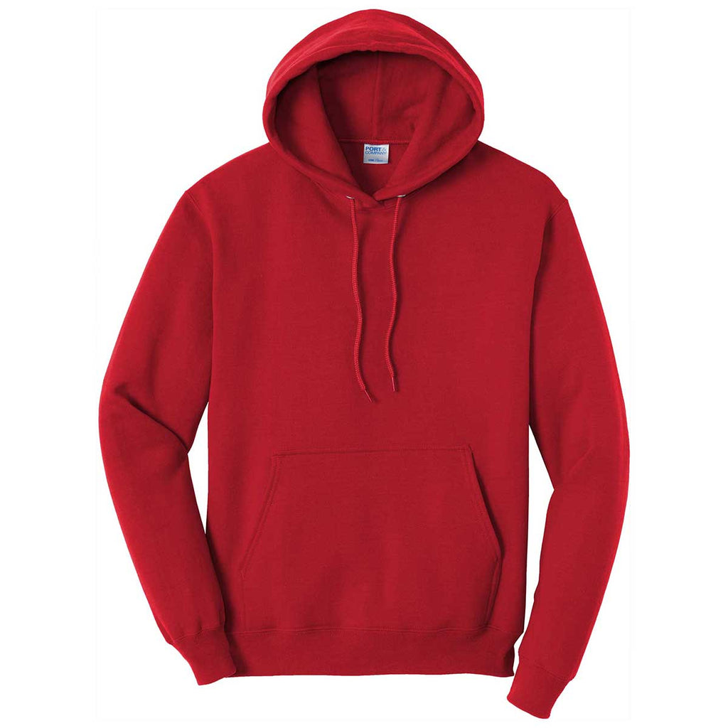 Enjoy total comfort in a custom Port & Company Men's Red Tall Core Fleece Pullover Hoodie with heat transfer of your choice. Made of a cozy 50/50 cotton/poly fleece material with air jet yarn for a pill-resistant finish, this hoodie is a must have addition for most activities. Add a custom logo to use as team gear for team events or a company logo for use as employee gifts that will be worn often. The fabric lined hood with drawstrings, tear away label, and front pouch pocket create a look that is comfortable and convenient. The additional length is ideal for those who are taller but still desire coverage.Highlights