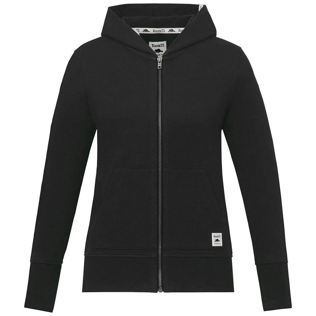 Look and feel great in a custom Roots73 Women's Black Canmore Eco Full Zip Hoodie. This straightforward hoodie is highly versatile as you can wear it to workout, head to work, or relax at home in total comfort. The full front zip design with an attached hood is convenient when you need to grab and go. Place an order today.Highlights