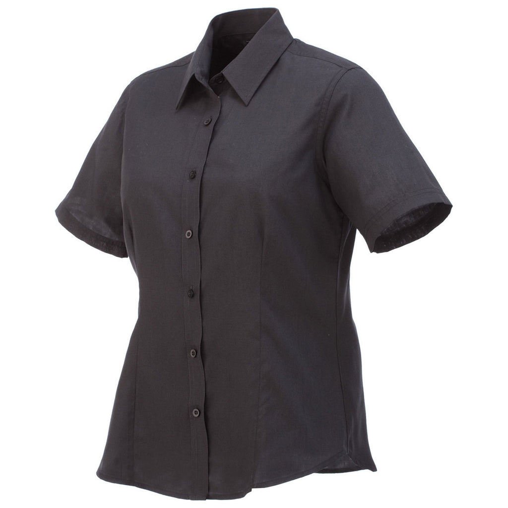 The Elevate Women's Black Colter Short Sleeve Shirt with your custom logo will look very stylish on your female employees. If you have a corporate event coming soon, consider including this apparel in your giveaway. Show your employees you appreciate them by giving them this high-quality item. Every time they want to look casual and professional at the same time, your employees will reach for this shirt. The Elevate Women's Black Colter Short Sleeve Shirt is made from poly-cotton and has a flattering fit. It comes in a variety of beautiful colors. Choose the one that goes with your company logo and give your employees a quality gift they deserve.Corresponding Men's Style: Elevate Men's Black Colter Short Sleeve Shirt
