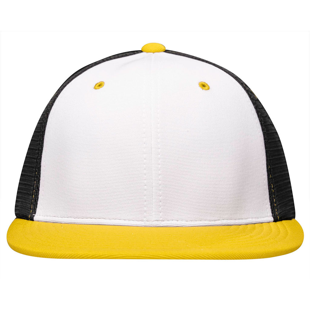 Add embroidery to the Pacific Headwear White/Black/Gold Premium M2 Performance Trucker FlexFit Cap for a new take on a true classic. This trucker mesh performance mesh cap has a pro-stitch finish that is durable enough for daily wear as employee apparel or while hanging with friends. Add a custom logo to start building your logoed apparel line with this perfect combination of form, fashion, and function. The FlexFit cap has anti-microbial properties, moisture wicking, and is stain resistant. The full-profile design with a flat visor has a closed back for a one size fits most creation that will be an instant hit.Highlights