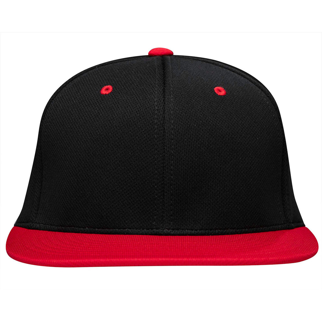 Turn heads with a custom embroidery Pacific Headwear Black/Red Premium P-Tec FlexFit Cap made of performance fabric and completed with a pro-stitched finish. The base color is made bolder with contrast colored eyelets and flat visor. Add a company logo to use as part of employee apparel to get your employees noticed or give them as custom gifts to loyal customers. The graphite undervisor with shapeable visor conforms to what you want and moisture wicking makes it comfortable for all day wear, even in warmer environments. A closed back means this is a one size fits most design.Highlights