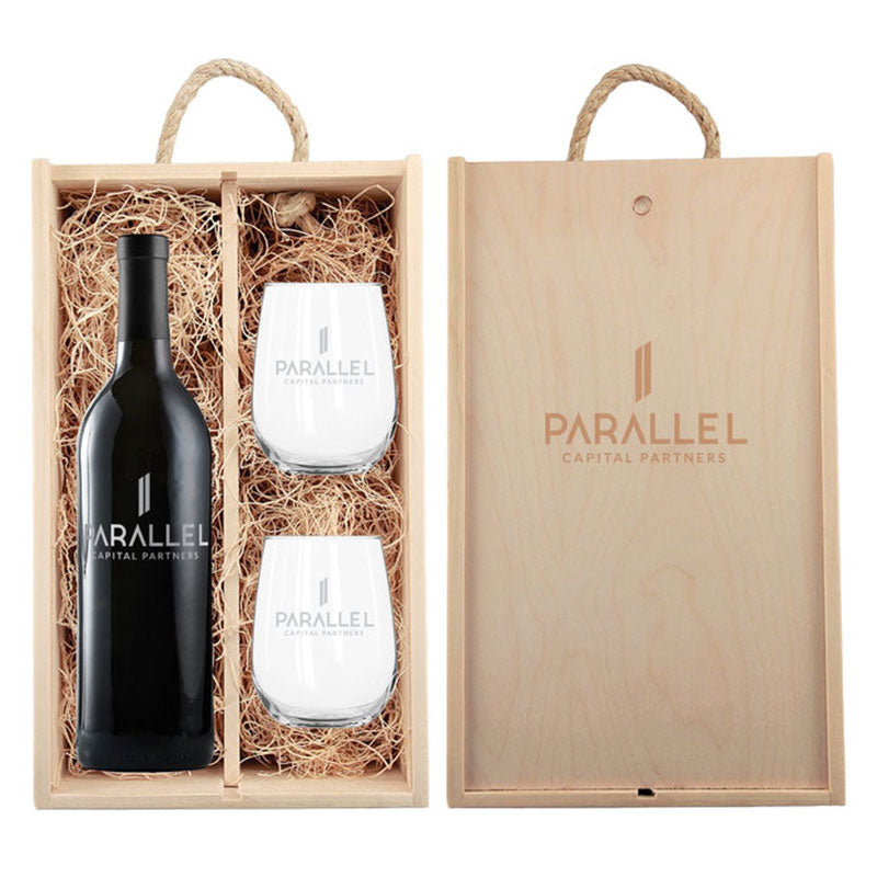 Laser engraving your company’s custom logo onto the A+ Wines Rustic Laser Engraved Wood Box with Custom Etched Wine and glasses with 1 Color Fill will provide you with a personalized corporate gift that exudes class and sophistication. Inside, you’ll find a pair of logoed wine glasses and a bottle of wine.