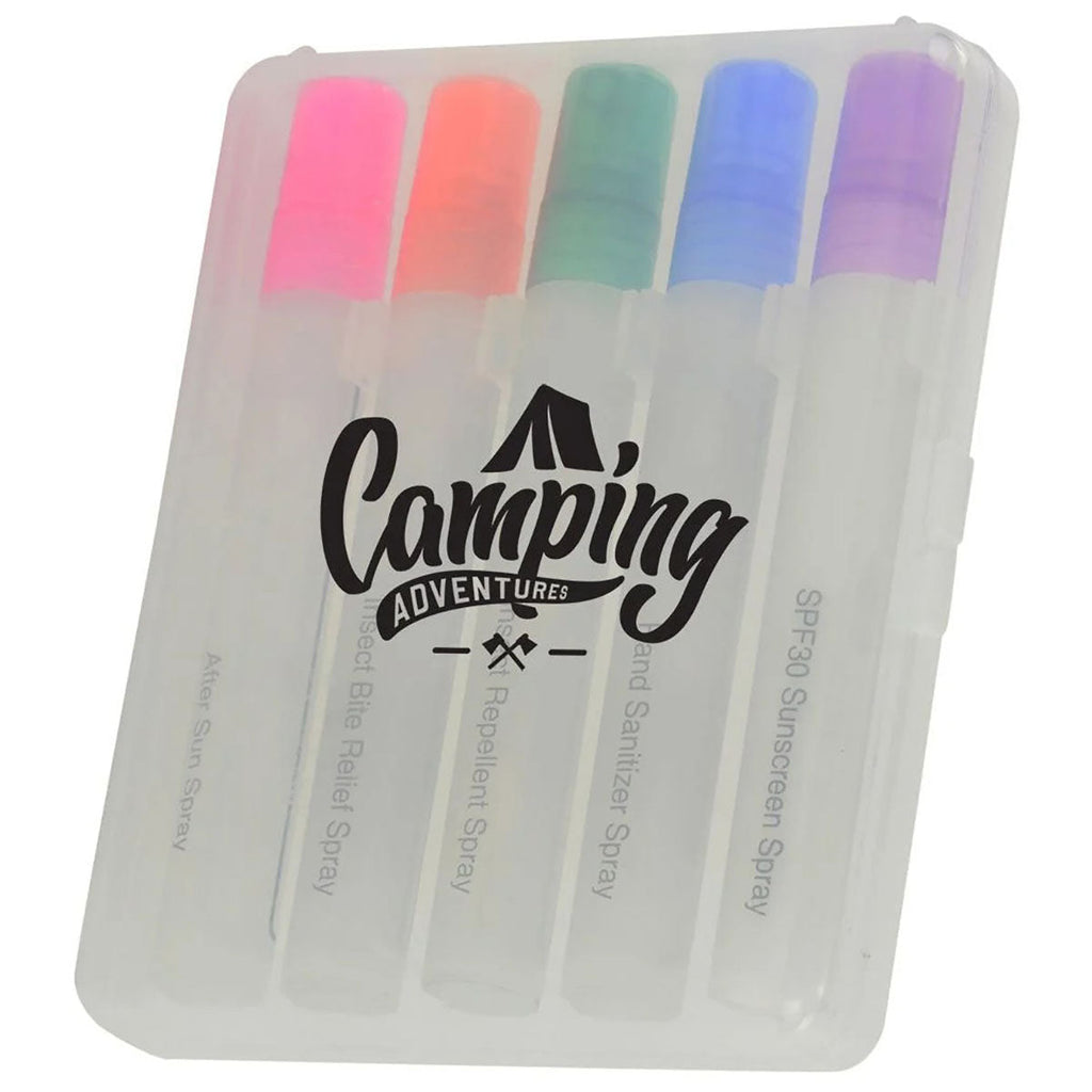 - Clear travel case includes .33oz. pen sprays of after sun, insect bite relief, insect repellent, hand sanitizer and SPF30 sunscreen.