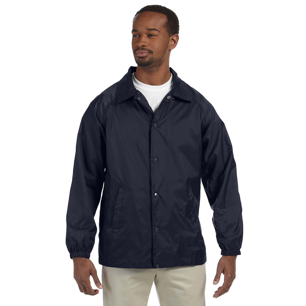 Let everyone know who is in charge by putting on the Harriton Men's Navy Nylon Staff Jacket. Constructed with a wind and water resistant finish, the versatile staff jacket makes the ultimate corporate gift to thank your employee for their hard work. Just remember to attach your corporate logo to send your team out in the community with a powerful marketing message. One-hundred percent nylon taffeta resists the types of rips and tears that ruin other styles of jacket. Soft Heather gray jersey lining enhances the comfort of the outer garment. Front welt pockets store car keys and electronic devices.