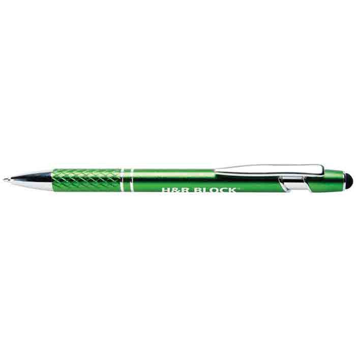 Rugged metal protects the ink cartridge on the Hub Pens Green Textari Stylus from damage caused by frequent drops from office desks and tables. The metal construction of the pen also generates a sleek appearance that will turn heads at corporate events. Take advantage of the head turning by attaching your corporate logo to the large upper barrel. The ideal promotional gift contains a brushed satin finish and silver accents that create an executive appearance for the pen. Use the soft stylus to write messages on electronic devices such as an iPad or mobile tablet, without having to worry about scratching the sensitive touchscreen surface.