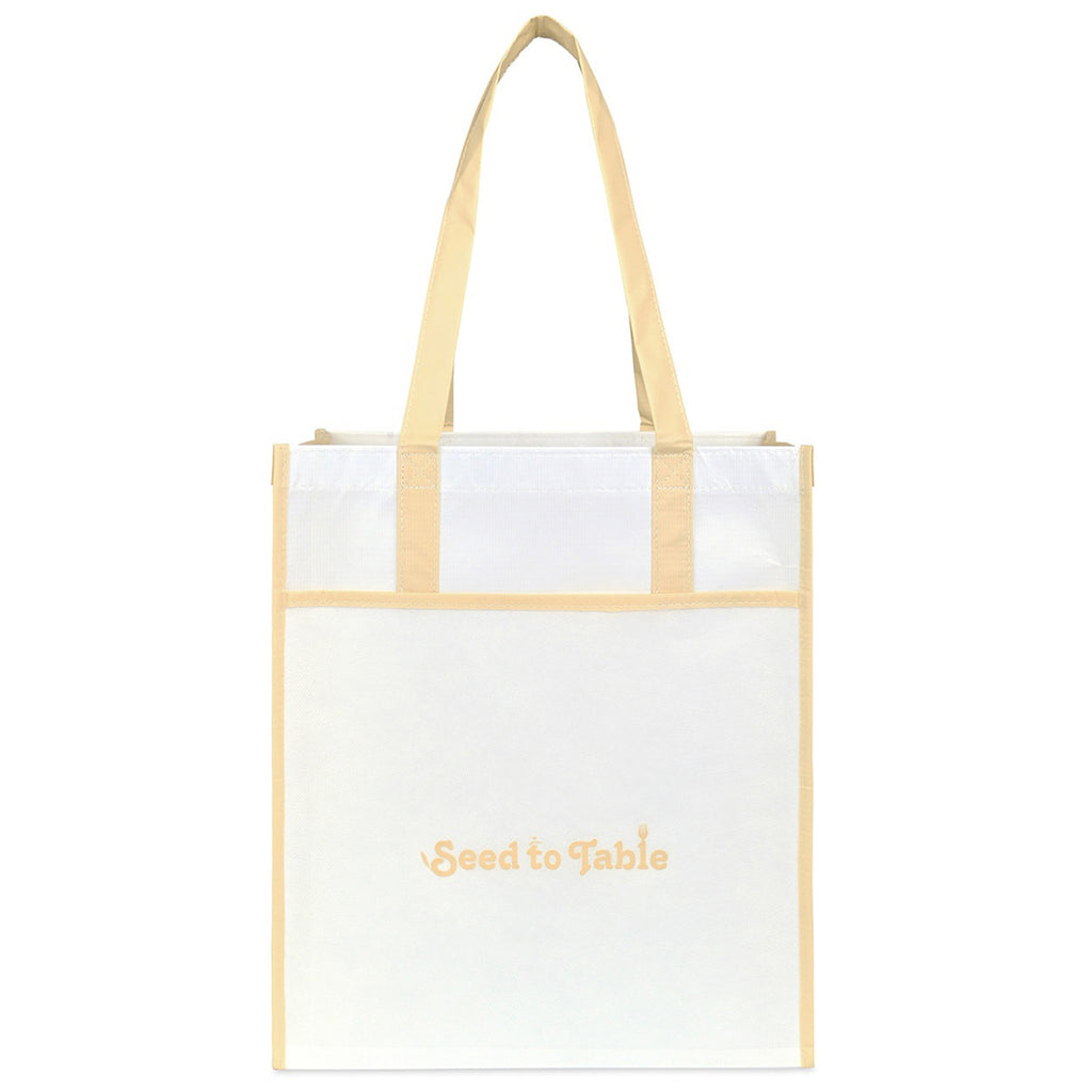 Add your corporate logo to the Gemline Oatmeal Harlow Laminated Recycled Shopper with colorful accents to be more eco-conscious while grocery shopping, running errands, or just shuttling the kids from place to place. These large bags with a roomy main compartment and extra front slash pocket are easy to use and then fold up for storage.The minimum order for this product is 150 pieces.