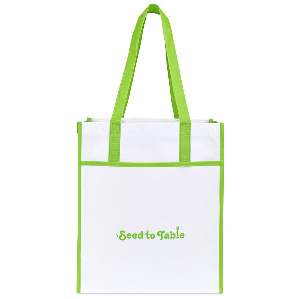 Add your corporate logo to the Gemline Lime Green Harlow Laminated Recycled Shopper with colorful accents to be more eco-conscious while grocery shopping, running errands, or just shuttling the kids from place to place. These large bags with a roomy main compartment and extra front slash pocket are easy to use and then fold up for storage.The minimum order for this product is 150 pieces.
