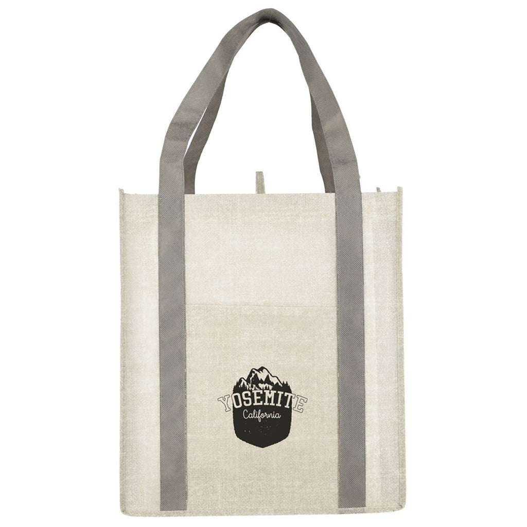 The Bullet Grey Neptune Recycled Non-Woven Grocery Tote is a practical accessory that will put your company's custom logo boldly on display while also helping the planet. The extra-large design allows for large grocery hauls, while an exterior pocket makes it easy to keep your smaller items organized.