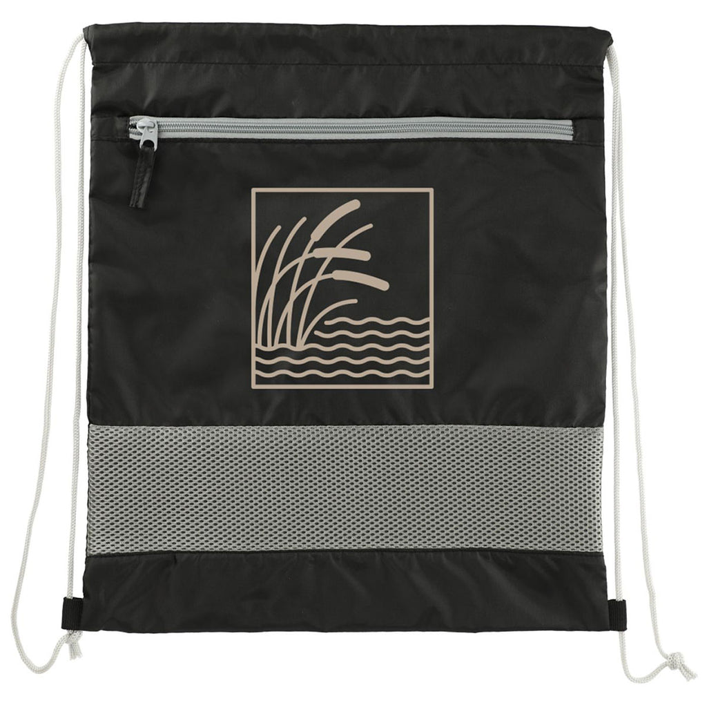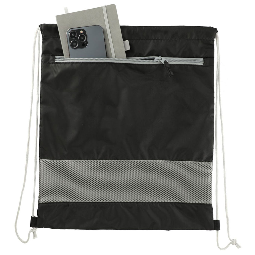 The Bullet Black Sparks Recycled Drawstring Bag is a spin on the classic cinch-style bag. Featuring mesh accents and a zippered front pocket for extra storage and added organization. It makes a great giveaway item at tradeshows and conventions. Add a custom-printed logo to highlight your brand.