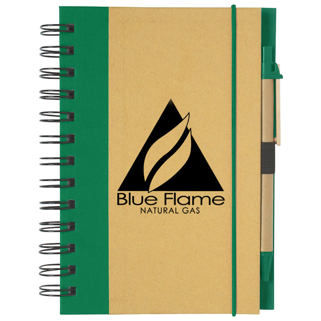 Choose your corporate design or logo for the Hit Natural/Green Eco-Inspired Spiral Notebook & Pen to give to new hires, share at meetings, or give away at networking events. The 80-page lined notebook has a matching pen with a paper barrel held in an elastic pen loop for organization. The cardboard cover is held closed with a band closure.