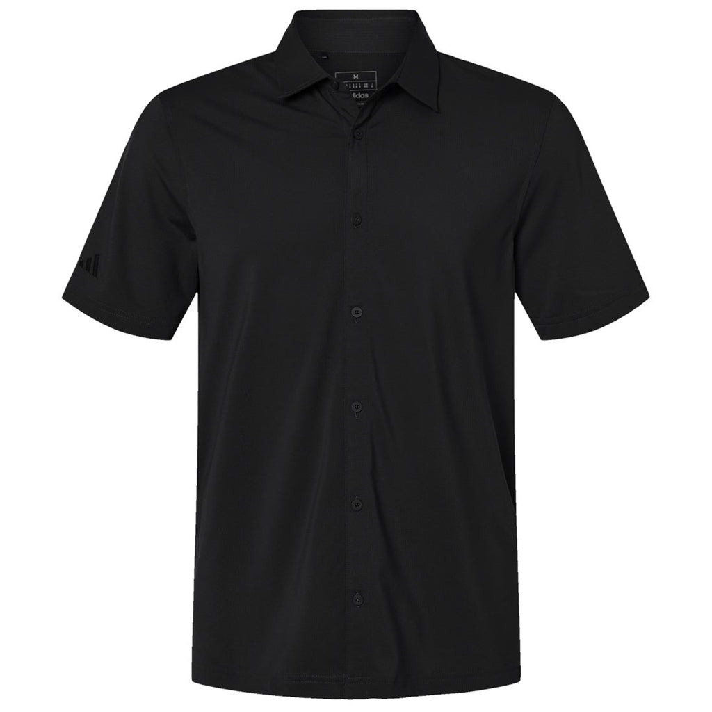 Design a corporate logo for the Adidas Men's Black Button-Down Short Sleeve Shirt for easy-to-wear employee apparel that will look and feel great all day. The polo collar adds to the overall look, and side hem slips allow for a range of movement. Perfect for servers, sales personnel, and your personal wardrobe.This product cannot ship outside of the United States.