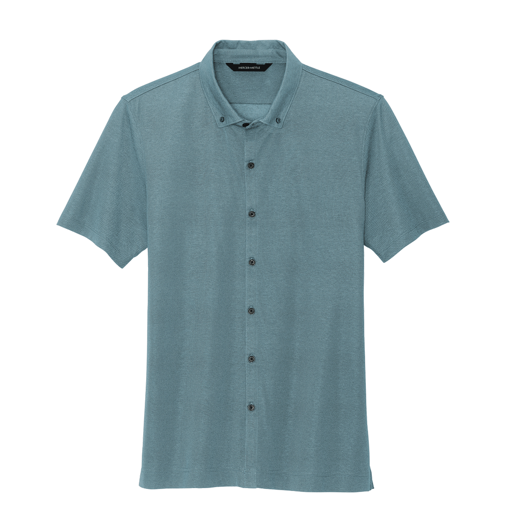 Choose embroidery for the Mercer+Mettle Men's Parisian Blue Heather Stretch Pique Full-Button Polo for a high-end look that works for the corporate office or a night out with friends. The polished silhouette is great for the office with a custom logo or to use as a unique uniform for employees. The moisture wicking fabric means all day wear is not an issue for this polo. Place an order today.