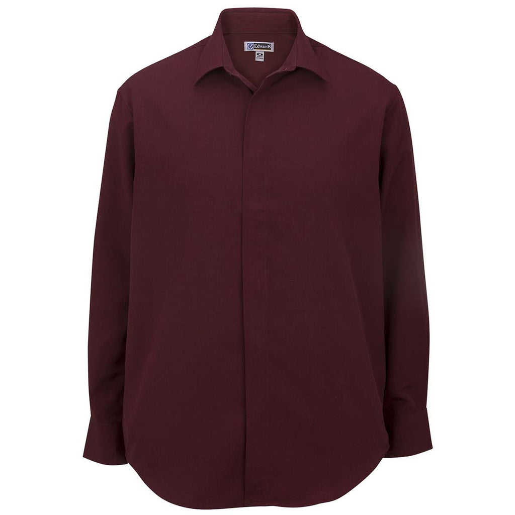 Create a custom updated look with the Edwards Men's Burgundy Batiste Cafe Shirt in a range of classic colors. Offering a modern fit in an understated style, this 100% polyester shirt is perfect for those who need employee apparel that demonstrates professionalism. Add a corporate embroidery to the long sleeve button up with chest pocket and narrow collar with hidden placket. Ideal for layering with a suit jacket as part of corporate uniforms the shirt is wrinkle resistant, offers soil release, and moisture wicking. Your custom logo will look beautiful on these shirts that offer the ability to be paired with jeans, slacks, or almost any type of attire you can imagine.Highlights
