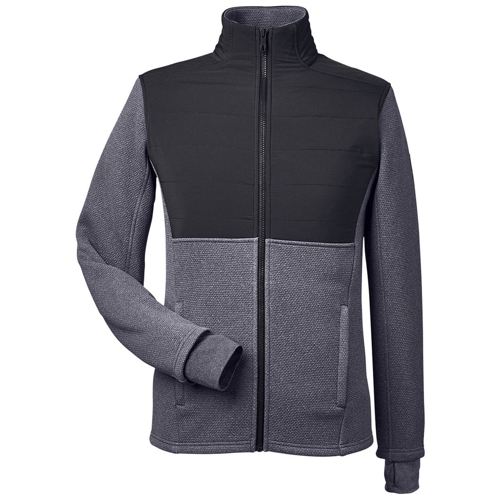 Add a company logo to the Spyder Me Frontier Heather/Black Pursuit Commuter Jacket for a fashionable approach to corporate apparel. This lightweight full front jacket is a high-end option for easy to wear warmth. Ideal for employee events as this is a functional, yet easy to style jacket with double-knit fleece and woven insulation for comfort. Forward set shoulder seams and a quilted front chest and back panels add to the look. Interior stretch storm cuffs and thumbholes keep hands warm as you go about your day.