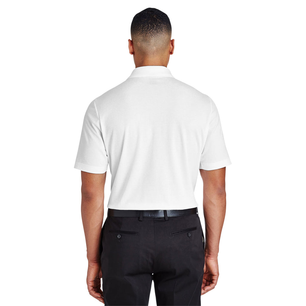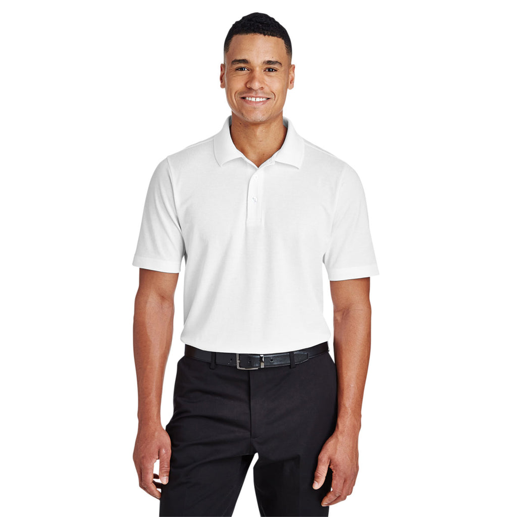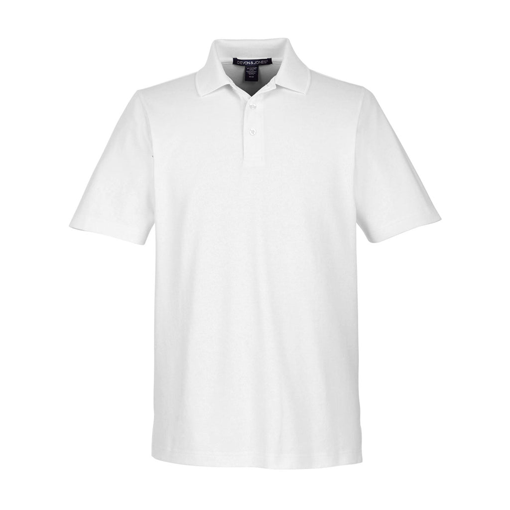 Before the next company golf outing, order the embroidered Devon & Jones Men's White CrownLux Performance Polo for the male members of your team. The front of the stylish polo contains 100% durable polyester, while the back side enjoys a cotton and polyester blend to enhance comfort. Moisture wicking technology keeps the skin dry and cool throughout every round. The matching flat knit collar will attract the attention of fellow players. Take advantage of the attention by adding a custom logo on the large imprint area. Dyed-to-match buttons exude panache to make the polo your go to corporate apparel for outdoor recreational activities.Corresponding Women's Style: Devon & Jones Women's White CrownLux Performance Polo