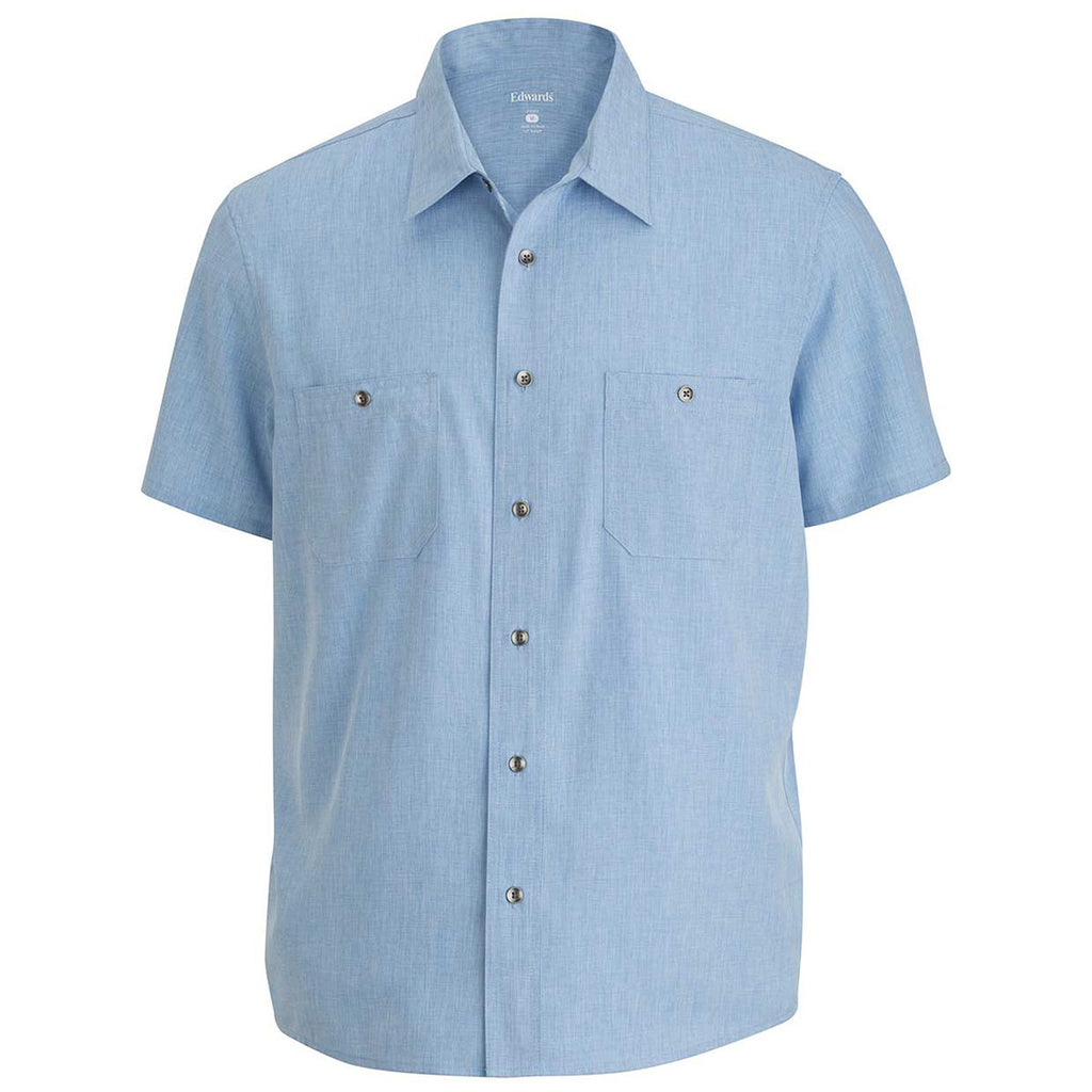 Edwards Men's Carolina Blue Heather Melange Ultra-Light Chambray Shirt with embroidery creates a stylish look ready for the office or a night out. The short sleeve button-up with two chest pockets is ultra-light making it great for the office with a jacket as a uniform or to head out with friends. Place an order today before these sell out.