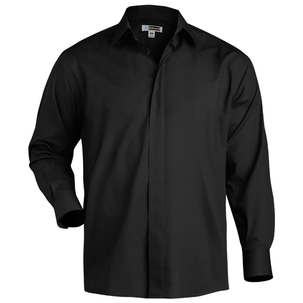 Show your custom style with the Edwards Men's Black Cafe Broadcloth Shirt. The cafe shirt offers a cafe collar, covered placket, and adjustable cuffs for all day professional wear. Excellent for servers at coffee shops, caterers, or those that need to be in the front of the house. Place an order today to have your staff looking their best.Highlights