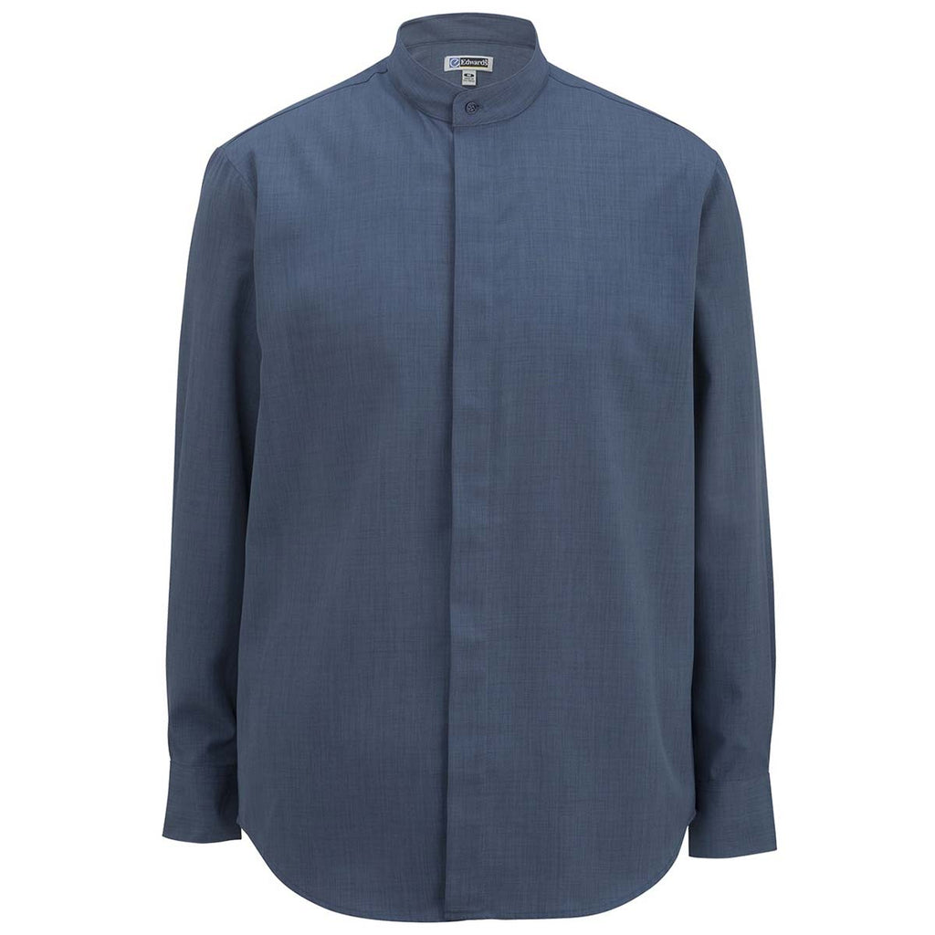 Enjoy all day custom comfort with the Edwards Men's Riviera Blue Batiste Banded Collar Shirt with contemporary pattern accents on a soft, supple polyester fabric. The ideal choice for hospitality apparel for those working in resorts, hotels, or restaurants, this long sleeve dress shirt has a hidden placket with unique banded collar. Easy to laundry these shirts are wrinkle resistant, moisture wicking, and offer soil release in an easily embroidered material. Add your corporate embroidery or custom logo to improve employee visibility even at large events.Highlights