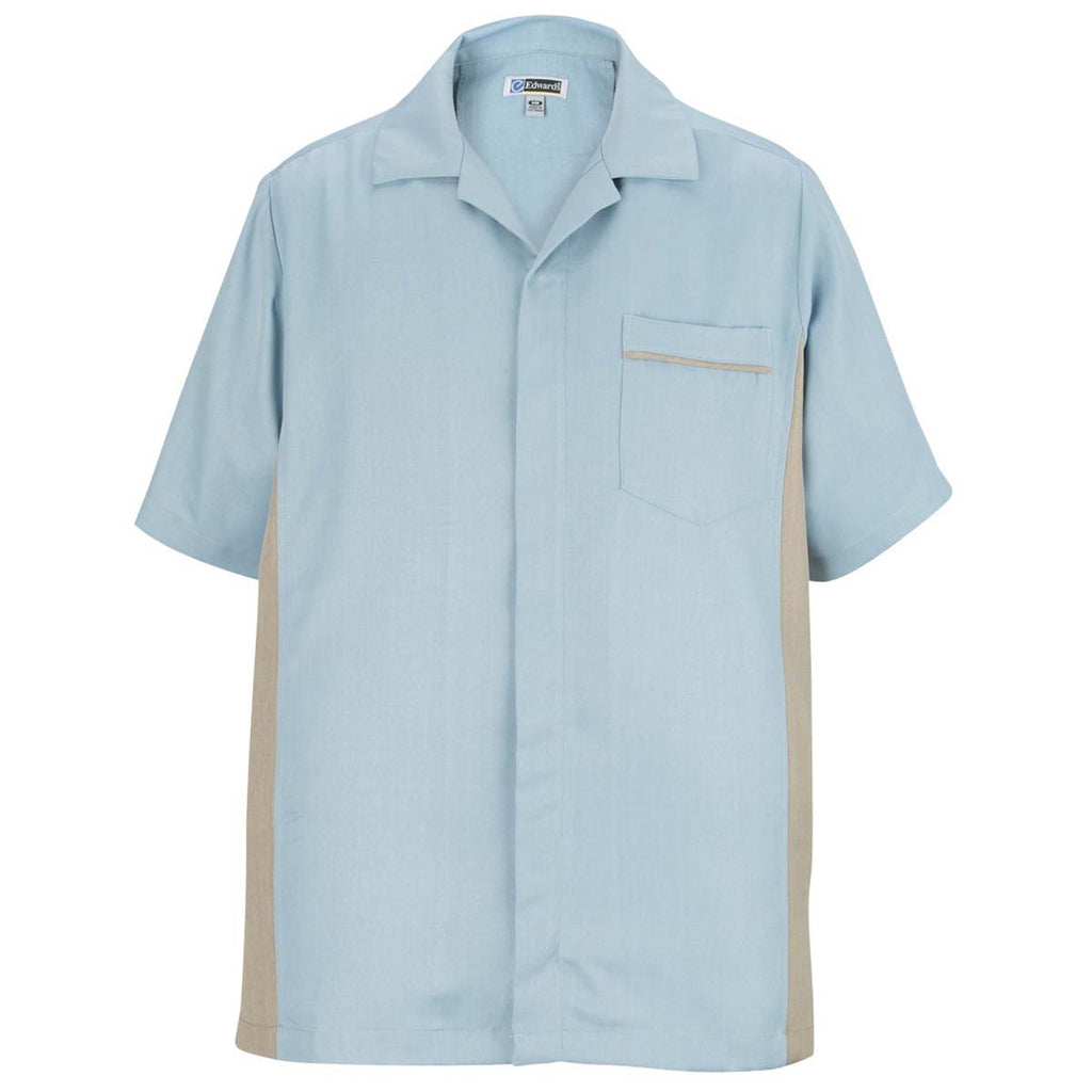 Add a custom embroidery to the Edwards Men's Glacier Blue Premier Service Shirt to create a look unique to your company or organization. Made of 100% polyester the contemporary styling of this comfortable to wear, easily washable shirt is unmatched. Available in six color combinations this service shirt is ideal as part of employee apparel when paired with slacks or as corporate uniforms for large organizations. The snap top button and reverse front zipper creates a tidy appearance on the short sleeve shirt with contrasting side panels and piping.Highlights