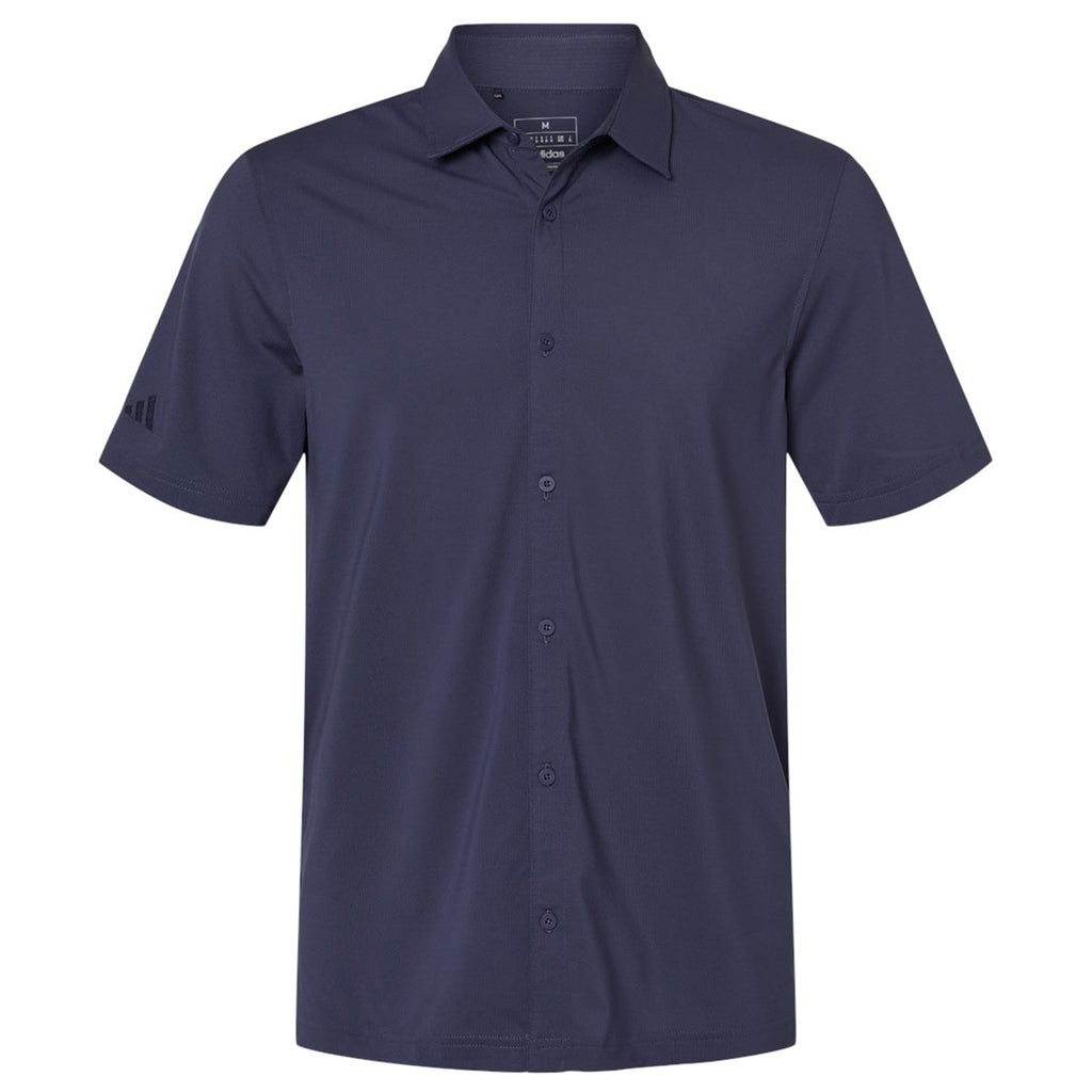 Design a corporate logo for the Adidas Men's Shadow Navy Button-Down Short Sleeve Shirt for easy-to-wear employee apparel that will look and feel great all day. The polo collar adds to the overall look, and side hem slips allow for a range of movement. Perfect for servers, sales personnel, and your personal wardrobe.This product cannot ship outside of the United States.