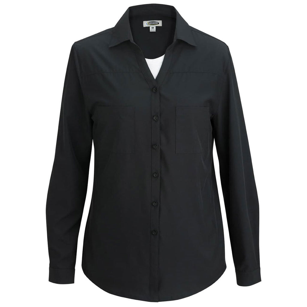 A company logo will elevate the Edwards Women's Black 2-Pocket Blouse to near perfection. This high-end blouse is a must-have when it comes to corporate apparel. Made of a polyester spandex blend to add a bit of stretch, this blouse is tailored with a split neck and button up front. Wear alone or pair it with a jacket or camisole to create a unique look that is ideal for the office setting. The long sleeves roll back to 3/4 for convenience and a slightly curved hem creates a feminine look. Try a custom logo to use these at trade shows or even employee gifts that can be worn in and out of the office.