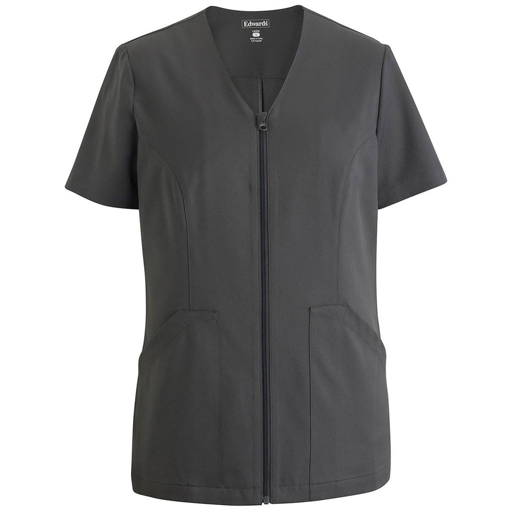 Enjoy a custom look with the Edwards Women's Steel Grey Sorrento Power Stretch Service Shirt with embroidery. The lightweight power-stretch polyester allows for natural movement without restriction making it ideal for industries like hairdressing, serving, or cooking as a uniform. The sleek look of the full front zip shirt that can be easily layered is professional while remaining functional. A V-neck with princess seams, angled front pockets, and a traditional fit creates an overall look. Moisture wicking, soil release, and Scotchguard finish also allows for easy wash and wear care.
