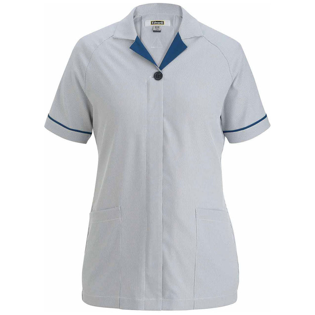 Add a company logo to the Edwards Women's Navy Peony Pincord Pincord Ultra-Stretch Tunic for a look that will keep those in the service industry and many others looking their best. This midweight tunic is made of 100% polyester ultra-stretch pincord with a traditional fit and open collar. The hidden zipper placket completes the look and two large patch pockets, key ring loops, and side vents make it a convenience at the highest levels. Ideal as a uniform that can be worn over almost anything and still look great, the moisture wicking tunic is a true must-have.Highlights