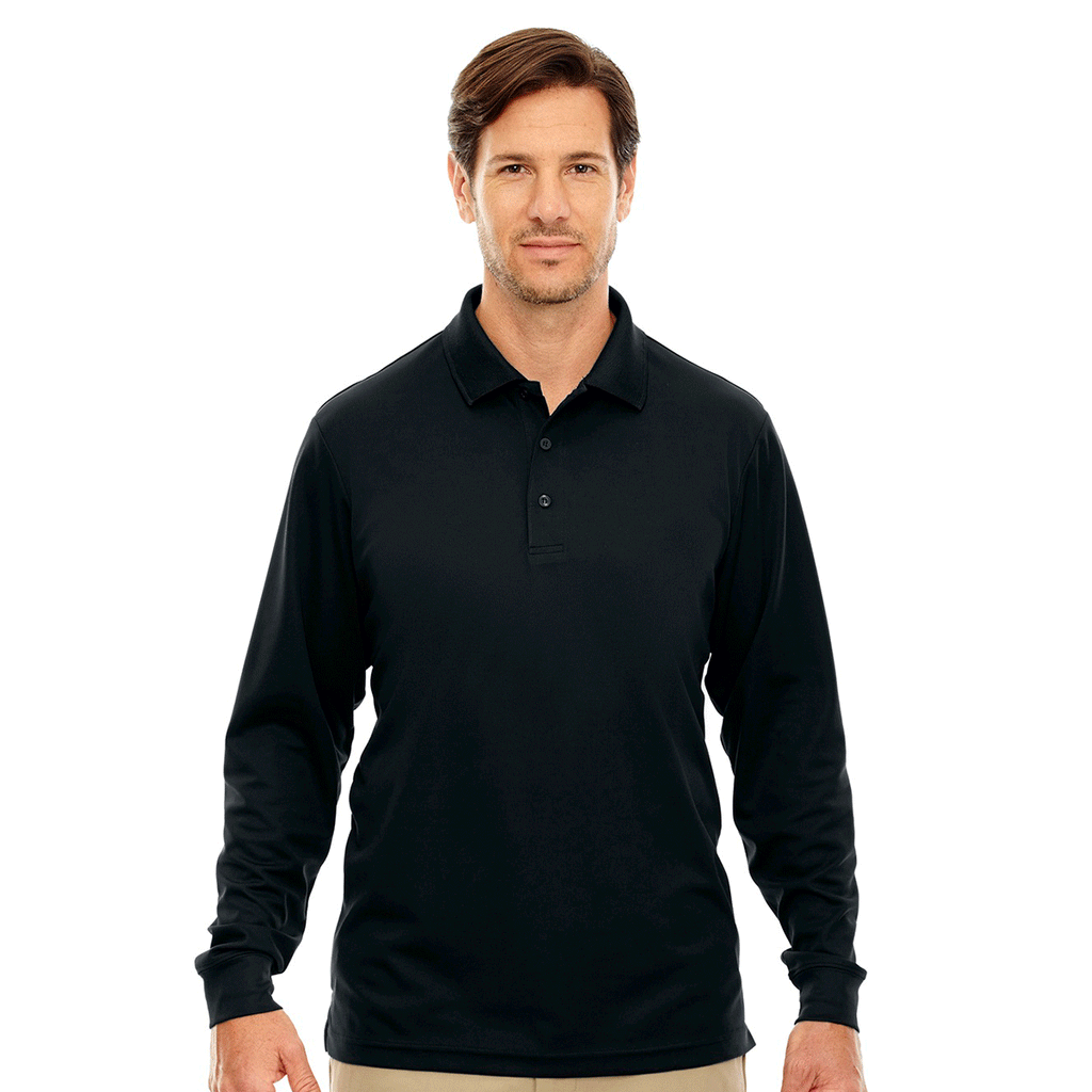 Give the Core 365 Men's Black Tall Pinnacle Performance Long-Sleeve Pique Polo as the ultimate corporate gift to your loyal customers and dedicated employees. The versatile long sleeve polo makes a professional fashion statement in the workplace and a sleek fashion statement during a night on the town. Moisture wicking technology quickly removes the perspiration that builds up because of you dancing the night away. Rugged 100% polyester never rips and tears to give you a go to shirt for all occasions. The matching flat knit collar adds a unique style element to a polo that exudes panache.