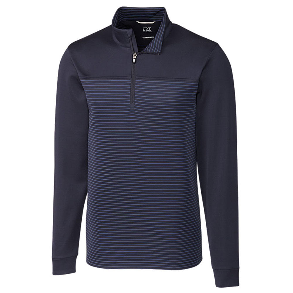Enjoy the classic look of this Cutter & Buck Men's Liberty Navy Tall DryTec Traverse Stripe Half-Zip with the addition of your custom logo. The top has a solid color look that offers enough room for a corporate logo for a personalized athleisure outfit that you can give away to workers during a special event. The bottom part includes a densely layered look with a series of small white stripes all around. The polyester and spandex designs include a double knit fabric feature that includes comfortable patterns for allowing air to move along well. The solid surfaces around the sleeves and collar add a sturdy design for use during the fall and winter seasons.Highlights