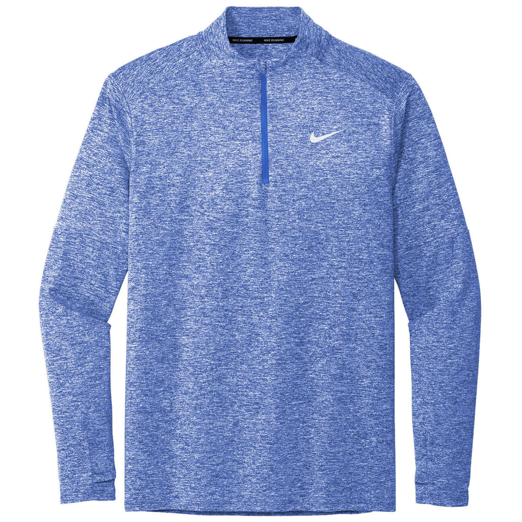 Embroidery will pop on the Nike Men's Royal Heather Dri-FIT Element 1/2 Zip Top that delivers the all-utility warmth and comfort you desire. The sweat-wicking fabric functions to keep you drier while enjoying a morning run or preparing for the big event. Add a custom logo and wear this 1/2 zip to the next meet as warm-up gear or a layering element. Order today before time runs out.