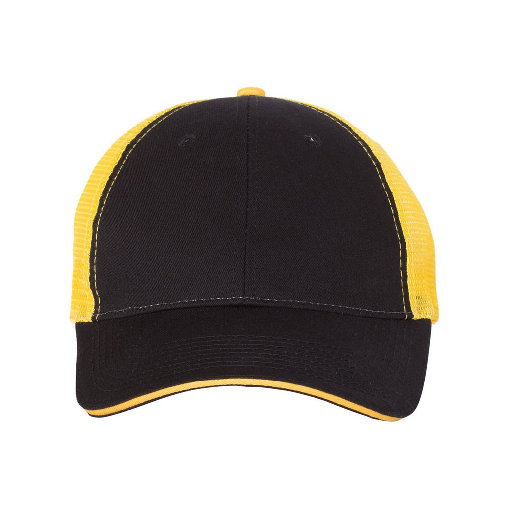 When you need headwear for a long trek cross country, put on the custom logoed Valucap Black/Gold Sandwich Trucker Cap. Designed with a cotton and polyester blend, the super soft cap resists rips and tears to keep the headwear in pristine condition for years to come. One-hundred percent polyester mesh in the back of the hat helps circulate air to keep you comfortably cool. Structured six panels present a professional appearance for customers who apply their skills outdoors. The mid profile design keeps the sun out of your eyes during corporate softball games. Attach your company logo to get the word out about your products and services.Highlights