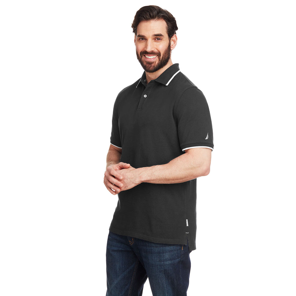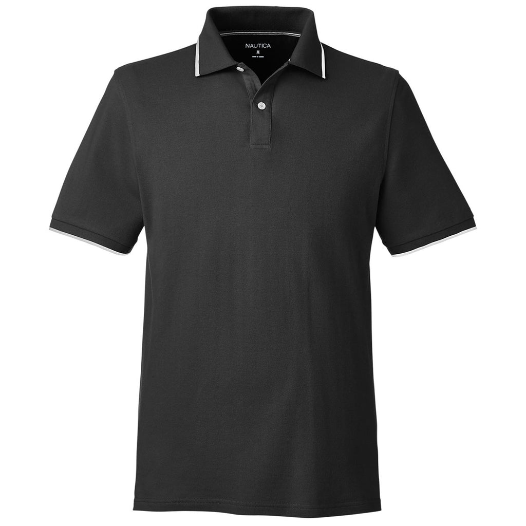 Stand out in a custom Nautica Men's Black Deck Polo with stand out striped tipping. This upgraded polo will showcase your company logo whether on the golf course, in the club house, or taking a long business lunch. Made of a cotton and polyester blend with two button placket, short sleeves, and ribbed trim, this is a polo everyone needs as part of their wardrobe. Perfect for employee apparel, but could be layered for a corporate apparel look and feel.