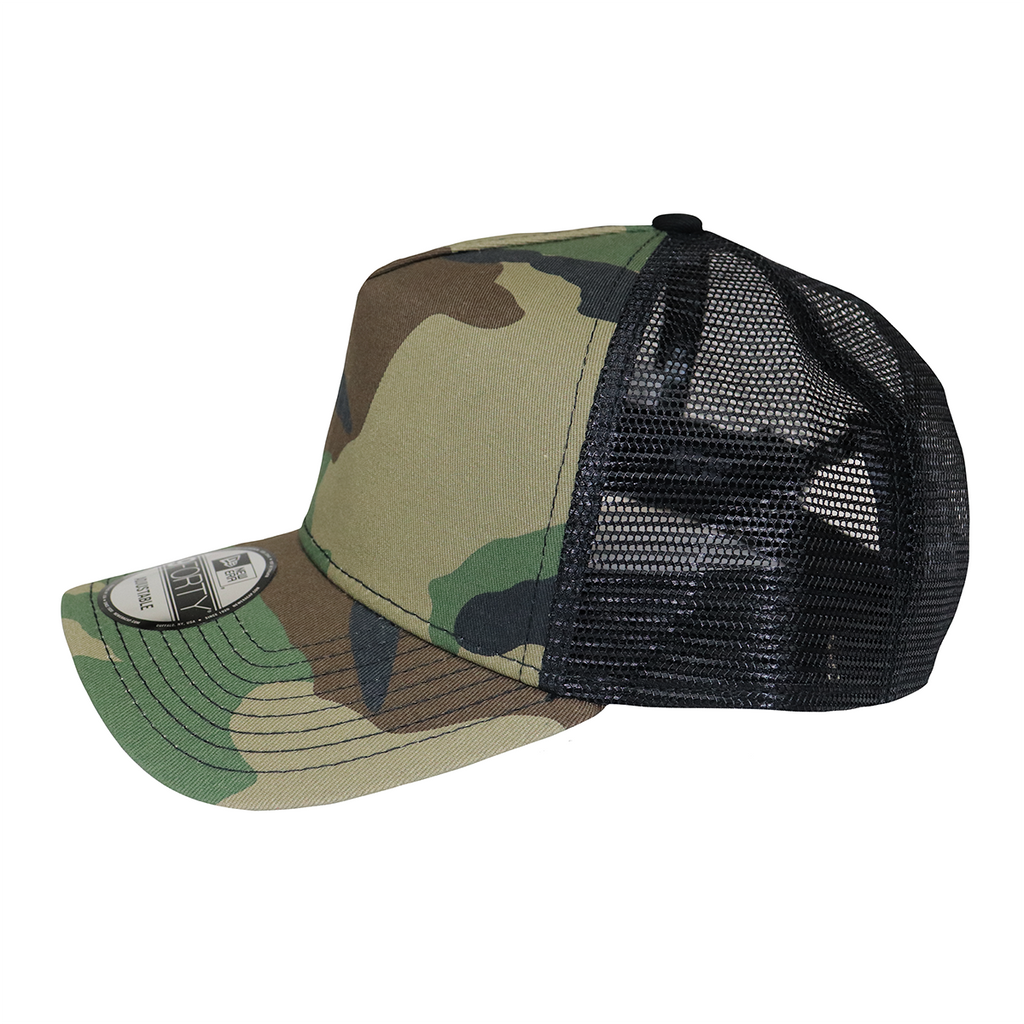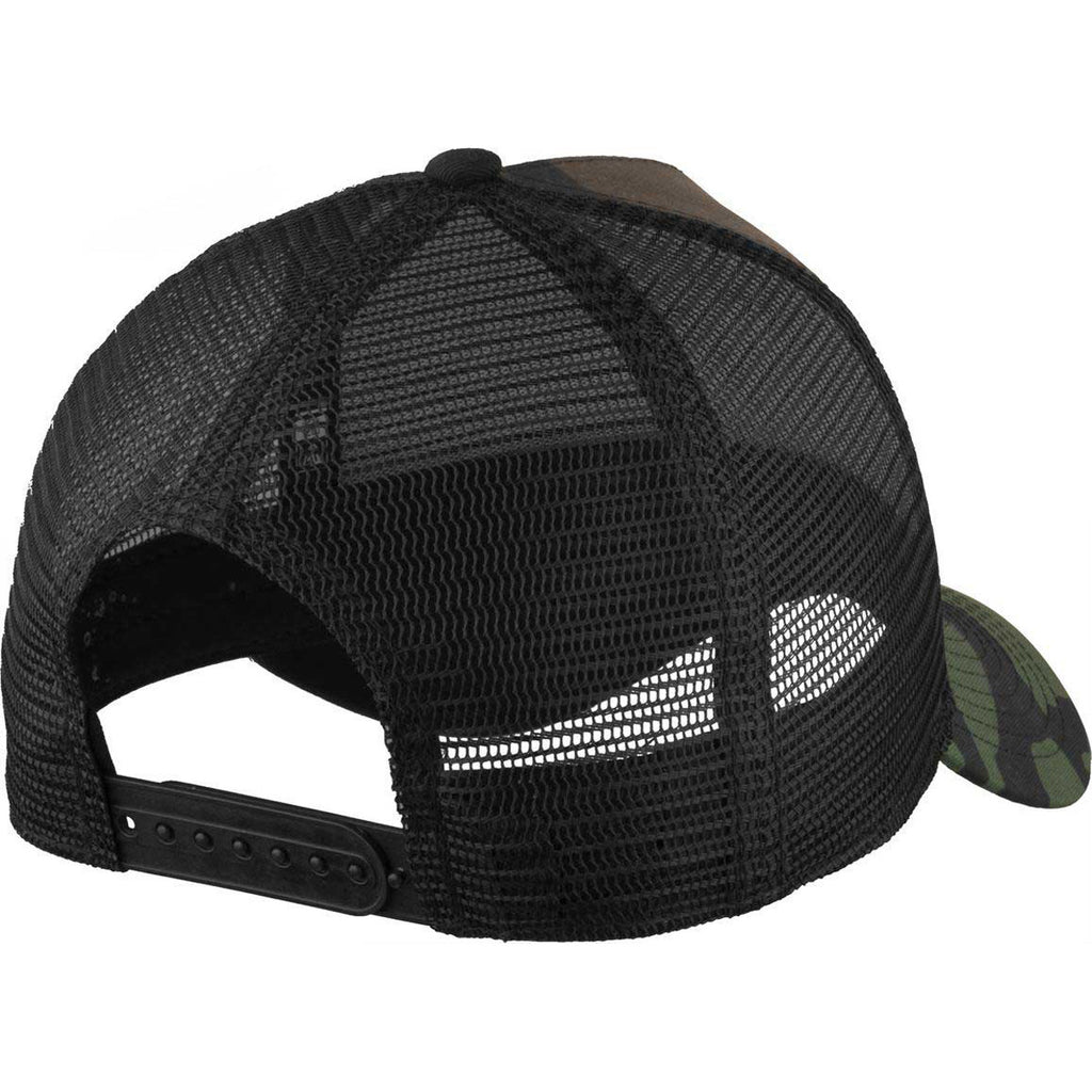 The panel custom embroidered New Era Camo/Black Snapback Mesh Back Trucker Cap offers superior ventilation to keep you cool under pressure on the baseball diamond or on the job. These personalized camouflage mesh back trucker hats feature a 7-position adjustable snapback closure, so they're true one-size-fits-all caps. That means they're perfect as promotional headwear when you add your team or company logo to the structured front of the hat! Perfect for your outdoorsy corporate logo or team logo, this custom cap features 100% cotton twill front panels and 100% polyester mid and back panels for maximum comfort as well as protection from hot weather. The 7-position adjustable snap will ensure that it fits well every single time, offering you the most possible comfort even if you wear this cap all day long. And you probably will.