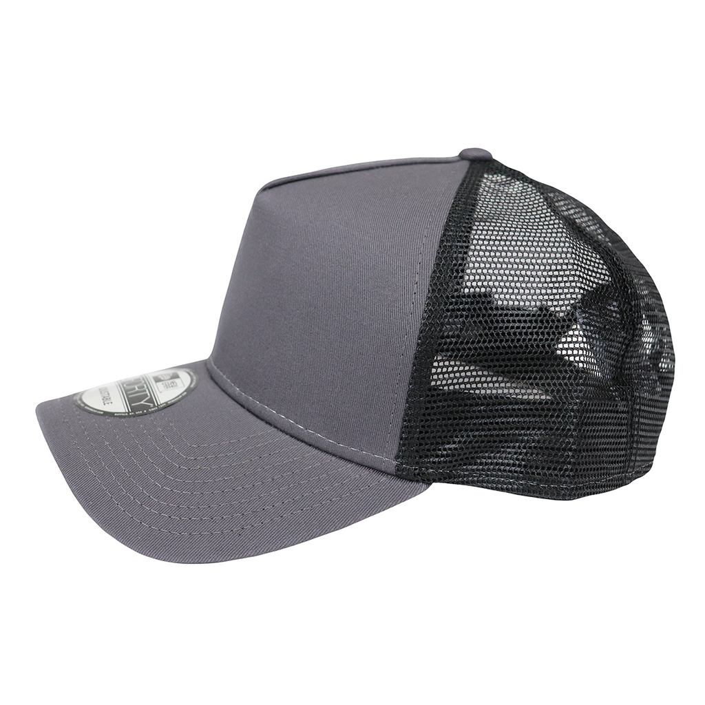 The panel custom embroidered New Era Graphite/Black Snapback Mesh Back Trucker Cap offers superior ventilation to keep you cool under pressure on the baseball diamond or on the job. These personalized two-toned grey and black mesh back trucker hats feature a 7-position adjustable snapback closure, so they're true one-size-fits-all caps. That means they're perfect as promotional headwear when you add your team or company logo to the structured front of the hat! Perfect for your outdoorsy corporate logo or team logo, this custom trucker cap features 100% cotton twill front panels and 100% polyester mid and back panels for maximum comfort as well as protection from hot weather. The 7-position adjustable snap will ensure that it fits well every single time, offering you the most possible comfort even if you wear this cap all day long. And you probably will.