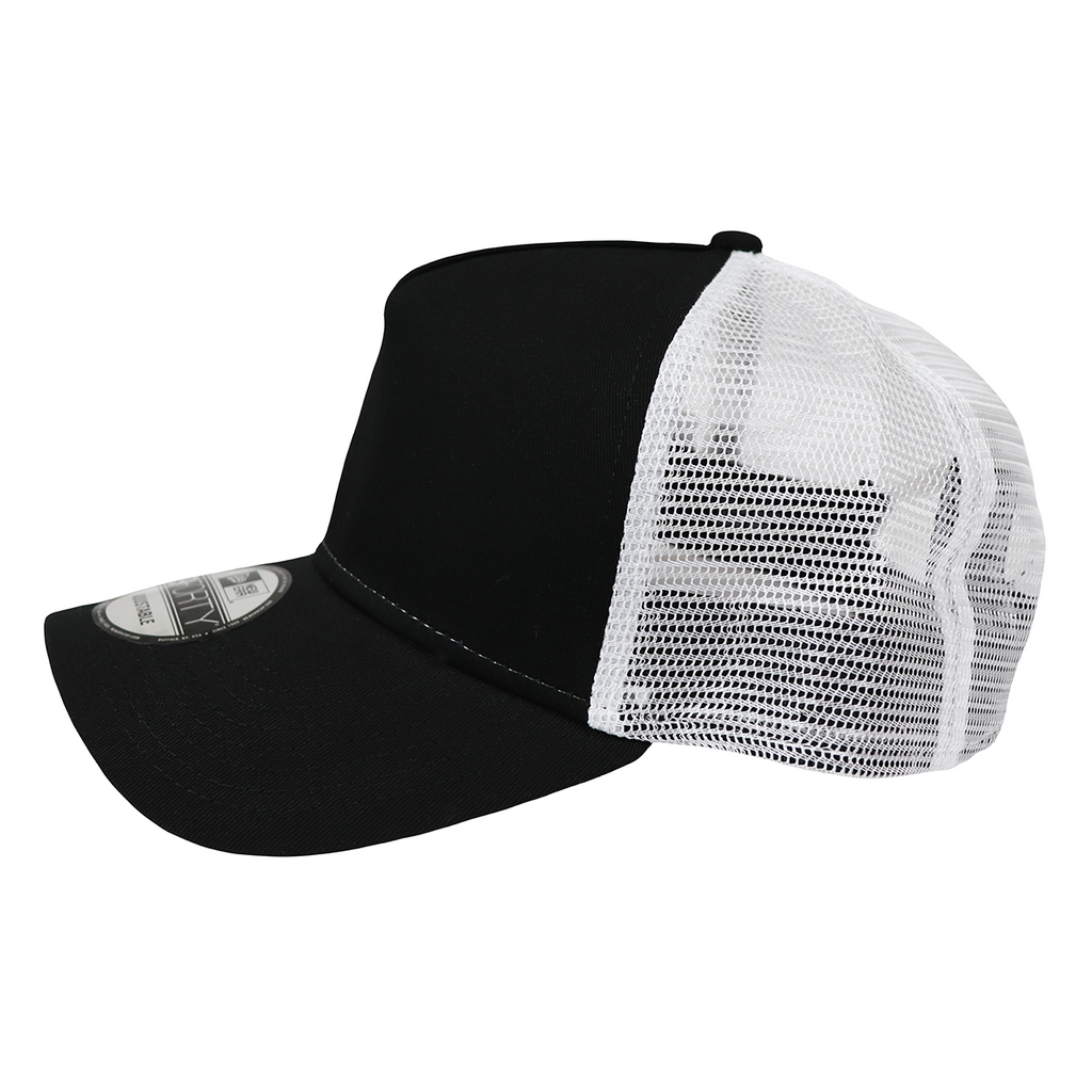 The panel custom embroidered New Era Black/White Snapback Mesh Back Trucker Cap offers superior ventilation to keep you cool under pressure on the baseball diamond or on the job. These personalized two-toned mesh back trucker hats feature a 7-position adjustable snapback closure, so they're true one-size-fits-all caps. That means they're perfect as promotional headwear when you add your team or company logo to the structured front of the hat! Perfect for your outdoorsy corporate logo or team logo, this custom trucker cap features 100% cotton twill front panels and 100% polyester mid and back panels for maximum comfort as well as protection from hot weather. The 7-position adjustable snap will ensure that it fits well every single time, offering you the most possible comfort even if you wear this cap all day long. And you probably will.