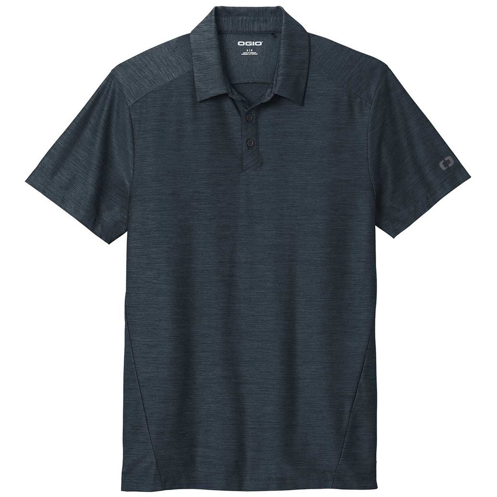 Classic comfort can be found in this updated custom OGIO Men's Navy Slate Polo available in a variety of sizes. The sophisticated tonal heather polo offers moisture wicking and stretch for range of movement with a polished look. Perfect for a company logo this polo would make an excellent company uniform or even employee gift. The self-fabric collar and angled 3-button placket has flat matte silicone buttons that create a professional look. Set in sleeves with open hems mean mobility will not be limited, even if hard at work all day.