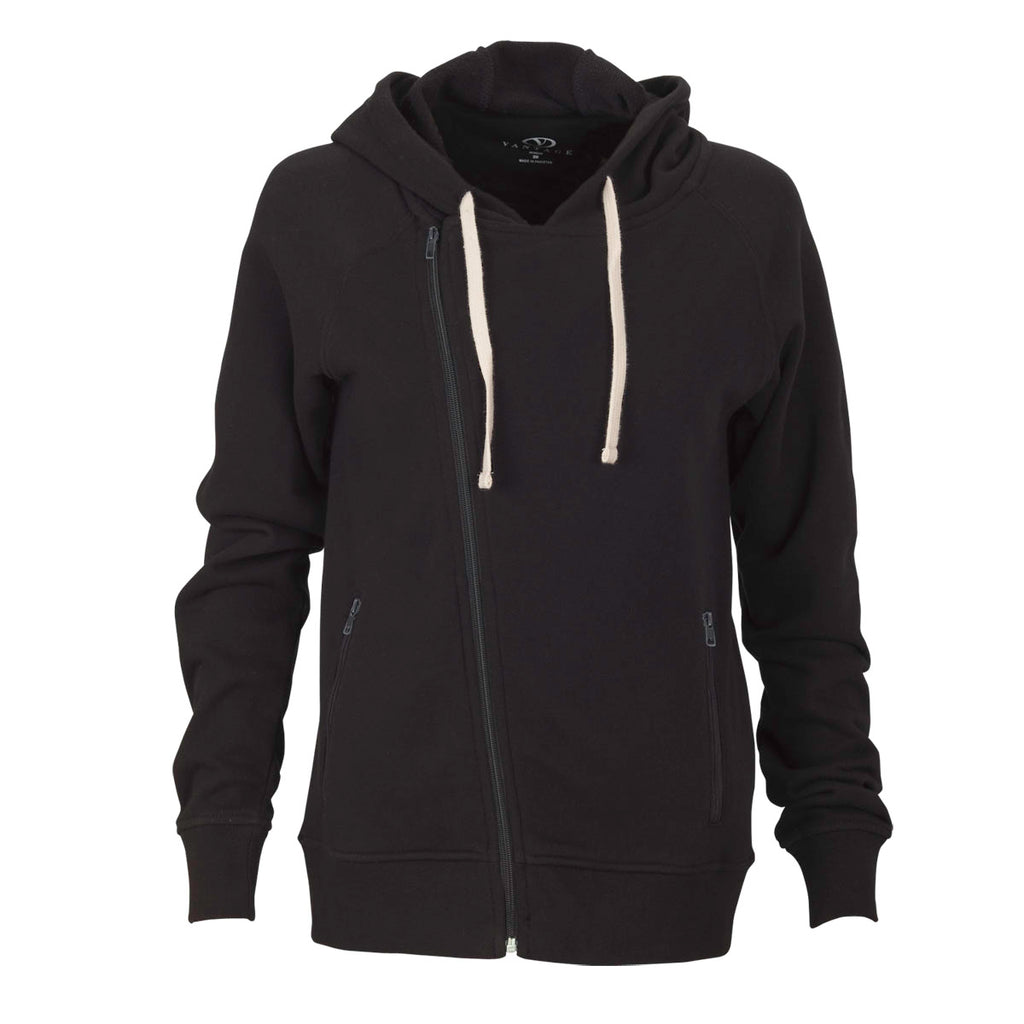 The asymmetrical zipper on the front of the company logoed Vantage Women's Black Fleece Moto Jacket presents a fashion edge that your professional colleagues will notice at industry trade shows. Take advantage of the attention by displaying the custom logo added on the large imprint area. The cotton and polyester blended fabric resists rips and tears to give you years of high performance use. Comfortable French terry fleece features a hood pulled shut by adjusting the contrast flat draw cord. Stylish raglan sleeves put the jacket in a fashion category the competition cannot join.Highlights