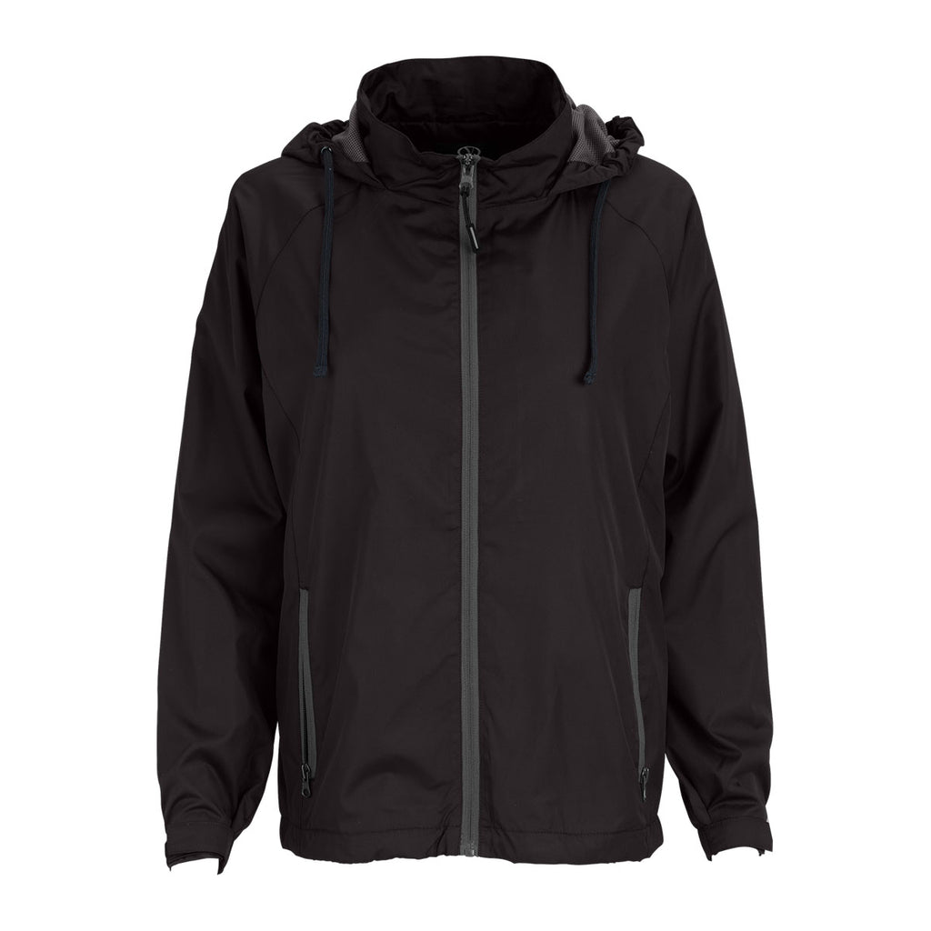 When it rains, it does not pour, as the company logoed Vantage Women's Black/Dark Grey Club Jacket keeps your body dry. The water repellent finish applied to the micro-poplin exterior of the jacket forces raindrops to slide off the surface. Contrasting mesh in the main section of the jacket circulates air to cool the body when the temperature rises. The lightweight corporate apparel contains highly durable polyester that handles everything the great outdoors throws at it. Hood lining traps heat to ensure your neck and head remain warm. Attach your corporate logo on the large imprint area to give your company more clout in the community.Corresponding Men's Style: Vantage Men's Black/Dark Grey Club Jacket
