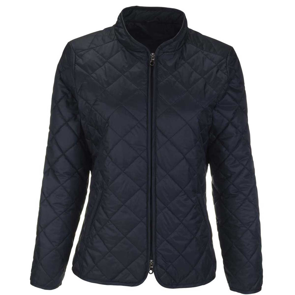 Convenience meets style in the custom Vantage Women's Navy Everett Jacket. Jet about town, enjoy watching a golf event, or use these spectacular jackets as company gifts. Add your corporate embroidery to the 100% polyester mini ripstop diamond quilted body to use these at trade shows or as extras for company uniforms. Available in black onyx or navy, these water repellent jackets fold into a self pouch when needed. The two way zipper, curved collar, and cuff and bottom hem complete the look. Place an order today in the company logo of your choosing to be prepared for what comes next.Corresponding Men's Style: Vantage Men's Navy Everett Jacket