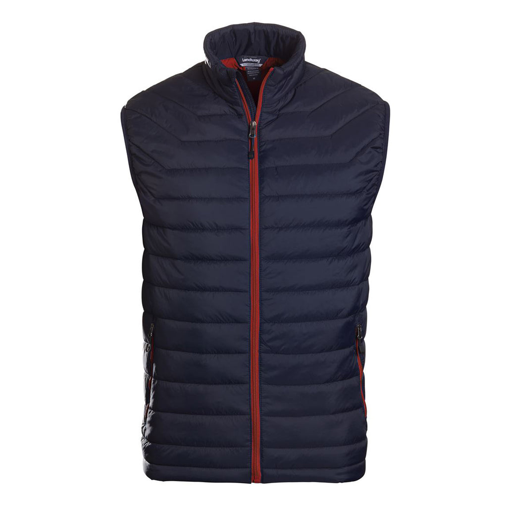The embroidered Landway Men's Navy/Russet Puffer Polyloft Vest makes the perfect corporate gift to reward the high achieving members of your team. Designed with a body contoured fit, the 100% nylon vest rarely snags on objects in the backcountry, such as jagged rocks and pointy tree branches, Even if the vest catches the edge of an object, rugged nylon resists rips and tears to provide years of high performance use. The sleek open waist hem and stand-up collar creates a refined appearance that lets everyone know you have everything under control. Add your corporate logo on the large imprint area to get the word out about your products and services.Highlights