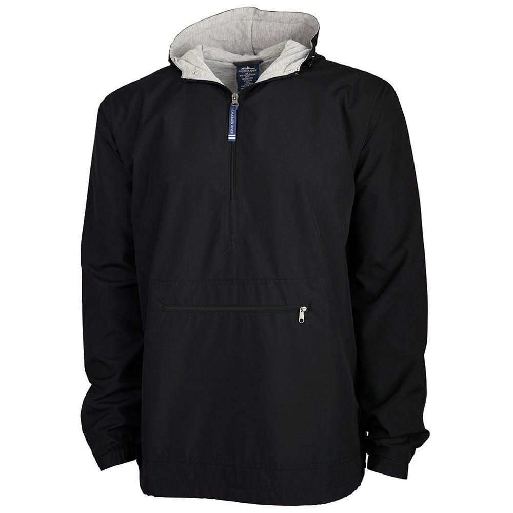 Add embroidery to the Charles River Men's Black Chatham Anorak for a look that can go from the morning commute to dinner with friends. The 100% Softex polyester material is wind and water resistant, yet lightweight and breathable. Add a company logo to the sleek quarter zip to give as employee gifts or to use as part of a corporate uniform when outdoors. The jersey lining had nylon sleeve lining for easy on and off when moving between work and home. A three-piece hood with shockcord drawstring creates a perfect fit and a zippered pouch pocket keeps small items secure. The versatile pull over is an ideal choice for many events and activities.Highlights