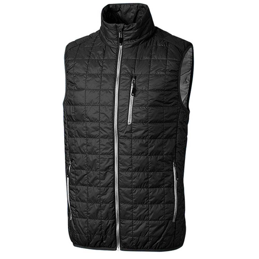 Stay warm with the Cutter & Buck Men's Black Tall Rainier Vest. With the addition of your company logo, this vest is the perfect way to market your company in a fashionable way. The vest has a full-length zipper at the front plus a smaller zipper near the middle for a breast pocket space. Added zippers are included for traditional hand pockets on both sides. The surface comes with a padded nylon feature with taffeta insulation to keep you warm. The brilliant and soft surface adds a comfortable space for any special outing of interest to you. Try this out for a special winter event or other cool-weather activity at your business. This is a nice prize for company events in the winter. Don't forget to add a brilliant custom logo on the surface.Highlights