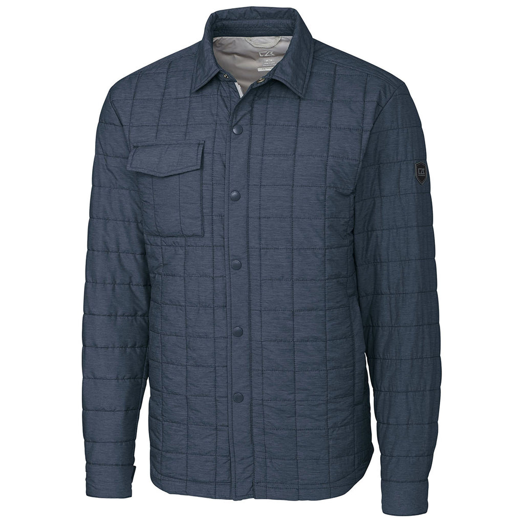 The Cutter & Buck Men's Anthracite Melange Tall Rainier Shirt Jacket offers ideal warmth in an attractive men's jacket. Add your company logo to the jacket, which comes in classic colors. This outerwear item is an ideal product to purchase and hand out to company employees and attendees at upcoming corporate events, such as recruiting events and golf events. Features of this men's jacket include 100% nylon material, CB Weathertec fabric, wind and water-resistant qualities, full zip and snap closure combination, right chest pocket with snap, and fully lined interior.