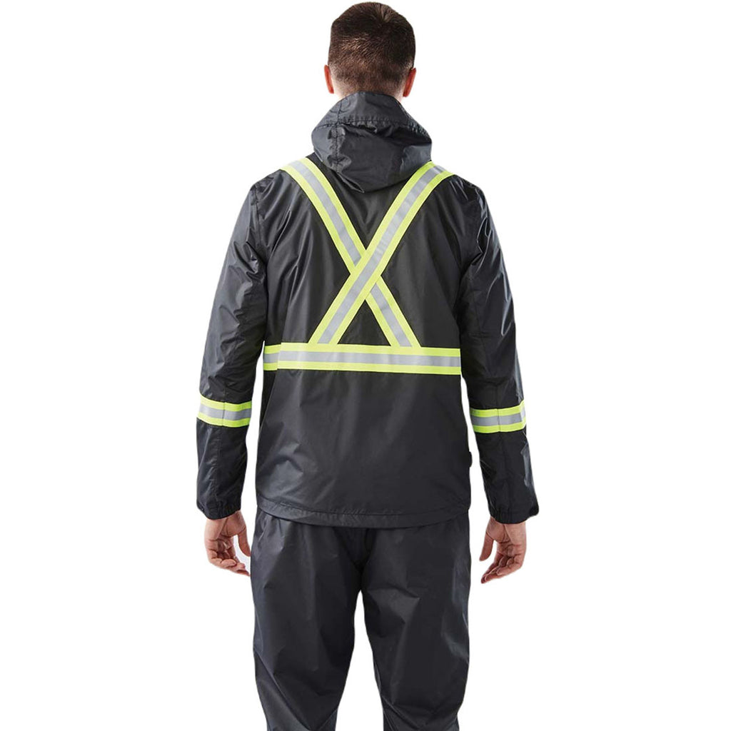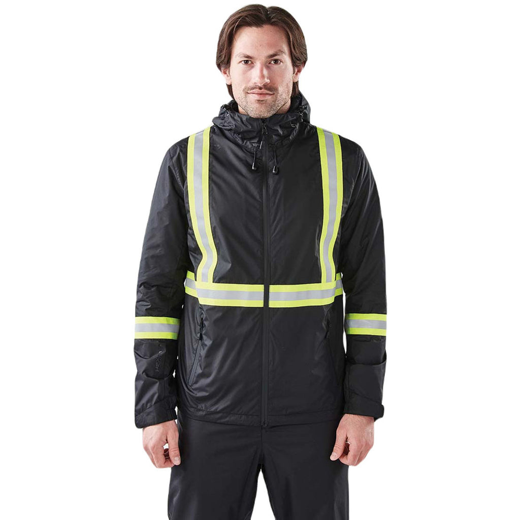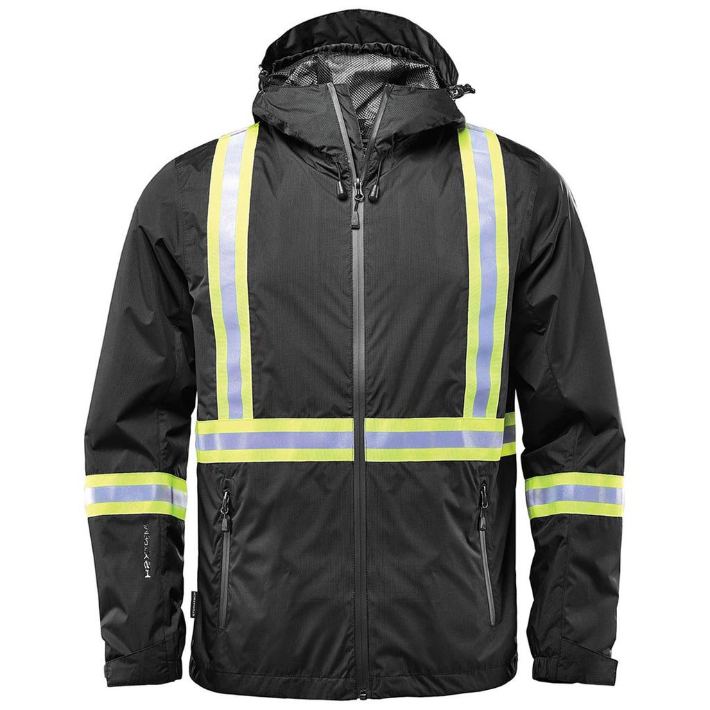 When safety is of the utmost importance, you'll want your team to be wearing a Stormtech Men's Black Olympia Reflective Shell that features your company's custom logo or design. Made from a H2XTREME PFC-Free waterproof/breathable fabric, this lightweight layering piece includes high visibility reflective taping for added visibility when on the jobsite.