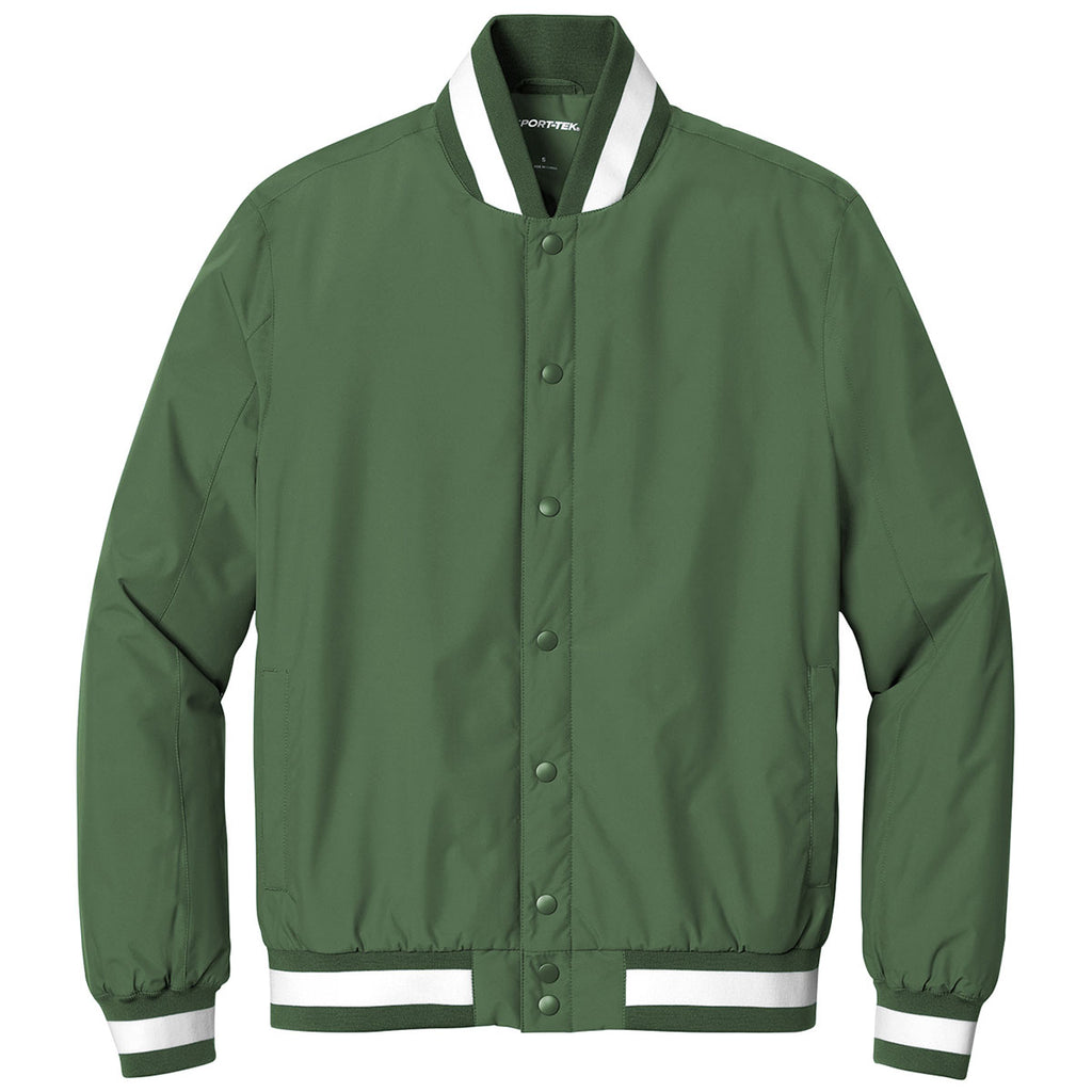 Sport-Tek Men's Forest Green Insulated Varsity Jacket with a custom logo is a great gift for yourself or others. The snap-button jacket screams coach or team member. The water-resistant coating and tag-free design make this great as part of team gear or for those supporters attending the games. Place an order today.Featured in our Fall 2024 Lookbook