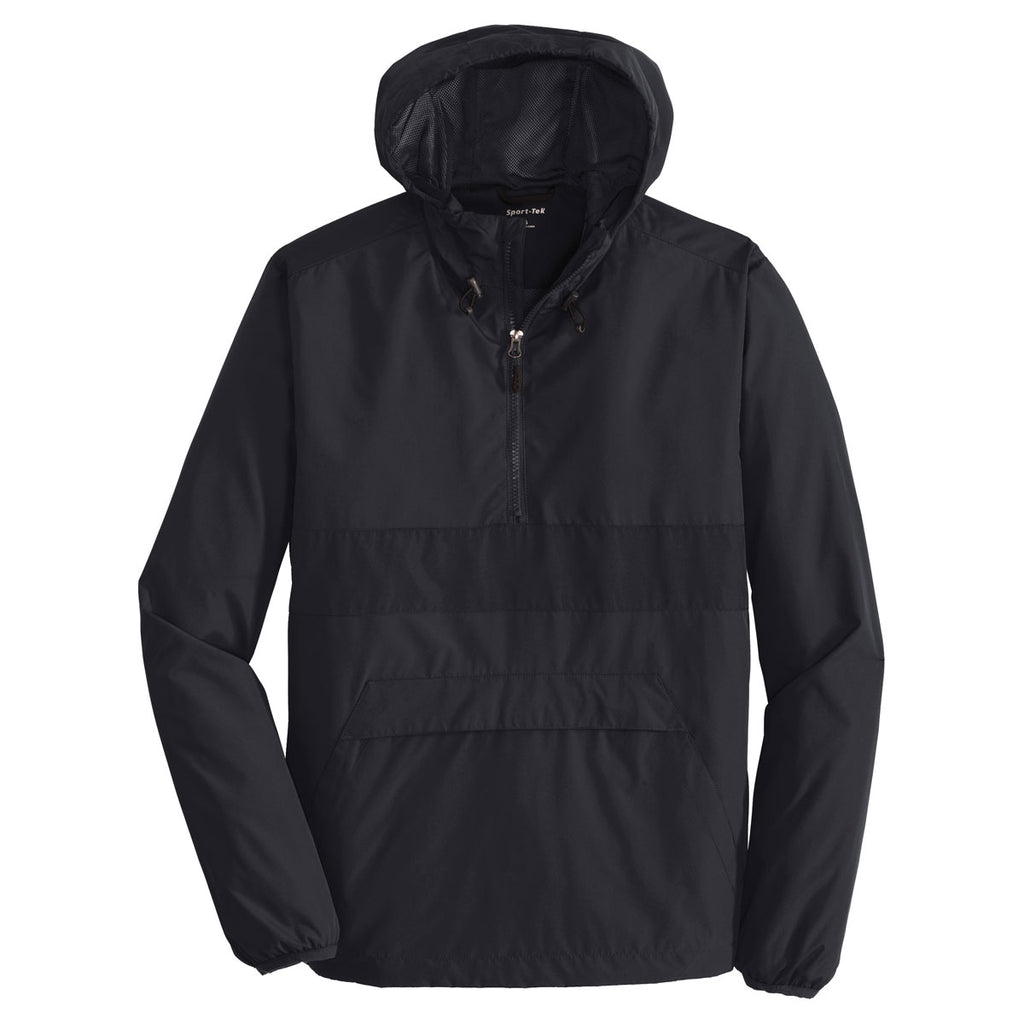 As a jacket for all seasons, the Sport-Tek Men's Black/Black Zipped Pocket Anorak includes a large zippered pocket that stores your valuables. It is frustrating to hear the smartphone ring and not be able to retrieve it in time to take phone calls. The large zippered pocket runs across the front of the jacket to give you instant access to electronic devices. Sport-Tek goes beyond standard comfort features by adding a chin guard and three-panel hood. One-hundred percent polyester woven sleeve linings keep your arms warm. Optimize the marketing potential of the anorak by attaching your company logo to the large embroidery area.Highlights